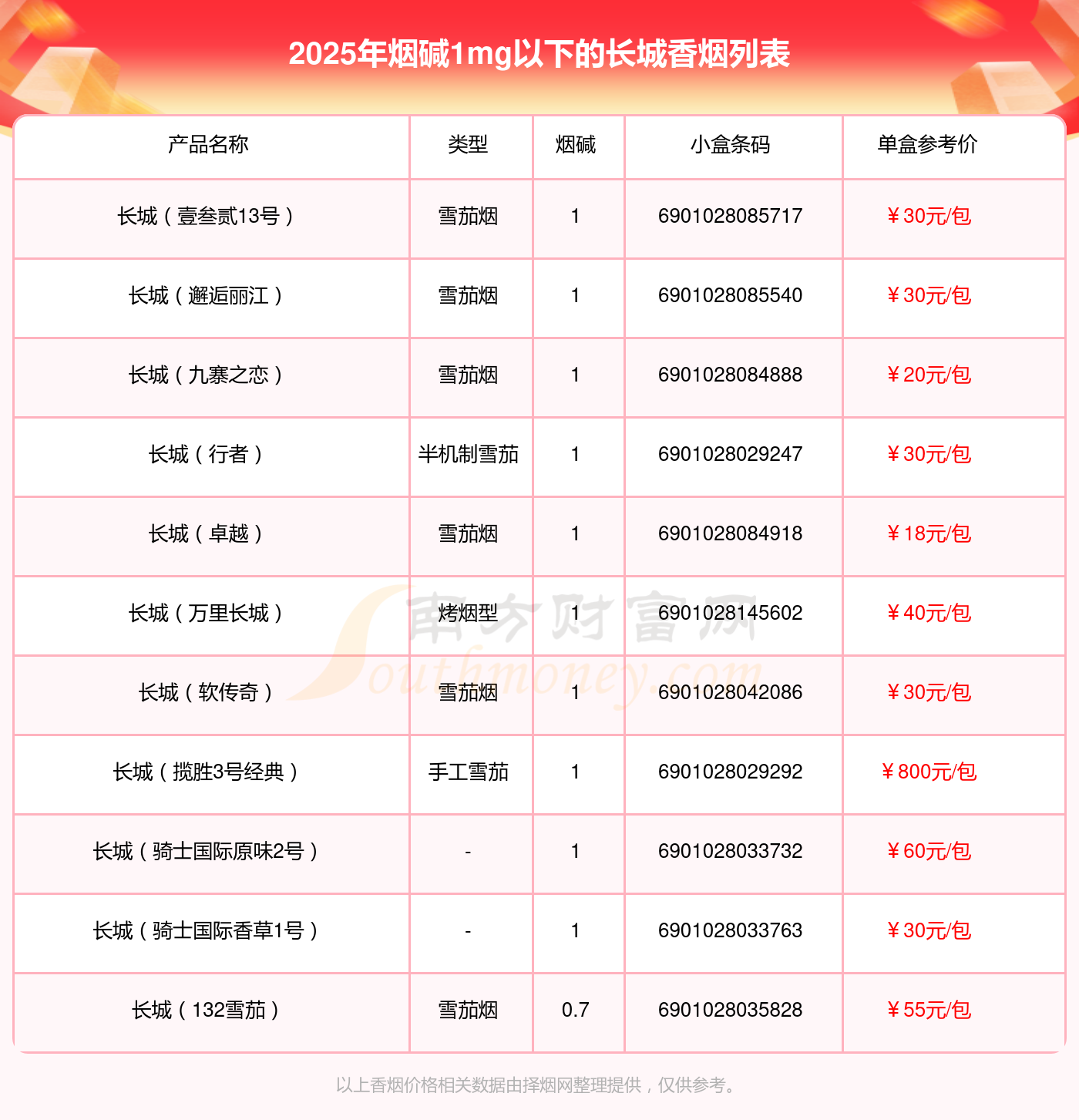 長城香煙煙堿1mg以下的煙有長城(壹叁貳13號)、長城(邂逅麗江)、長城(九寨之戀)、長城(行者)、長城(卓越)、長城(萬里長城)、長城(軟傳奇)、長城(攬勝3號經(jīng)典)、長城(騎士國際原味2號)、長城(騎士國際香草1號)等,具體價格如下: