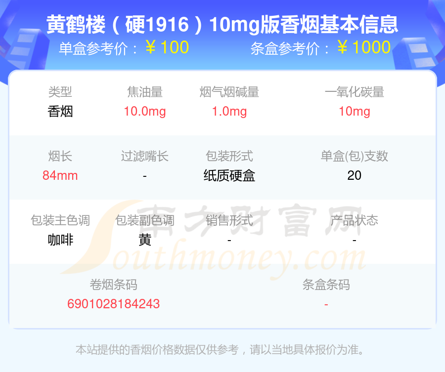 黃鶴樓(硬1916)10mg版單盒參考價:100元