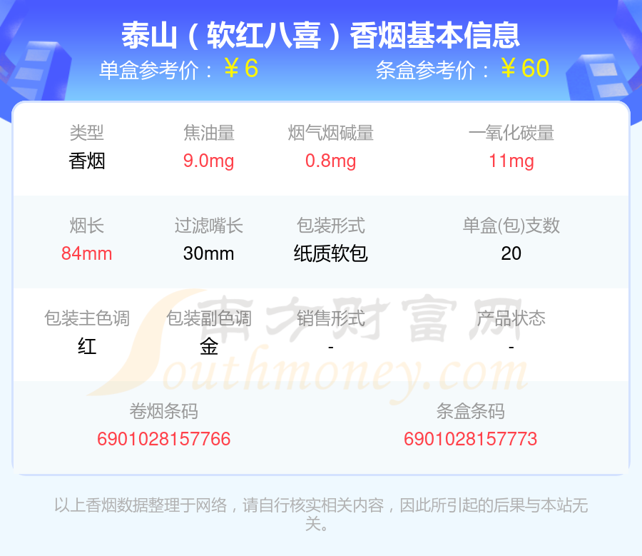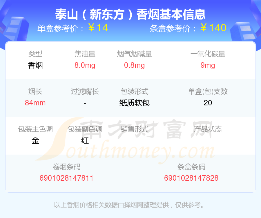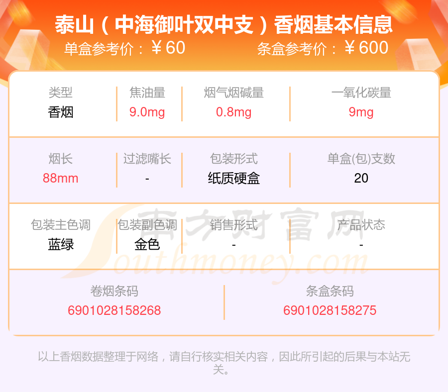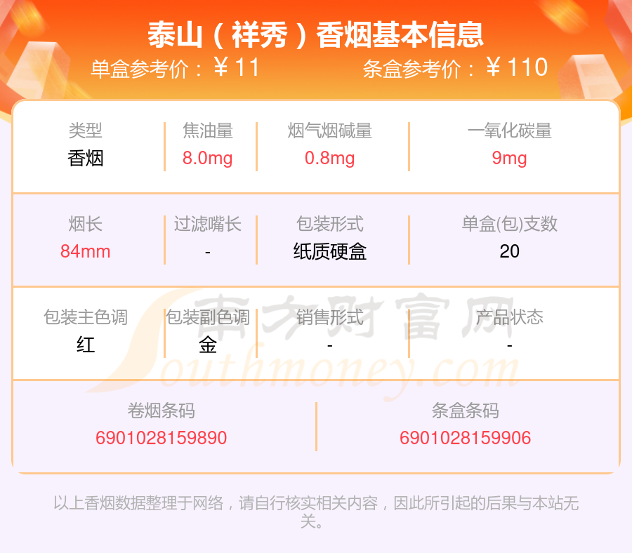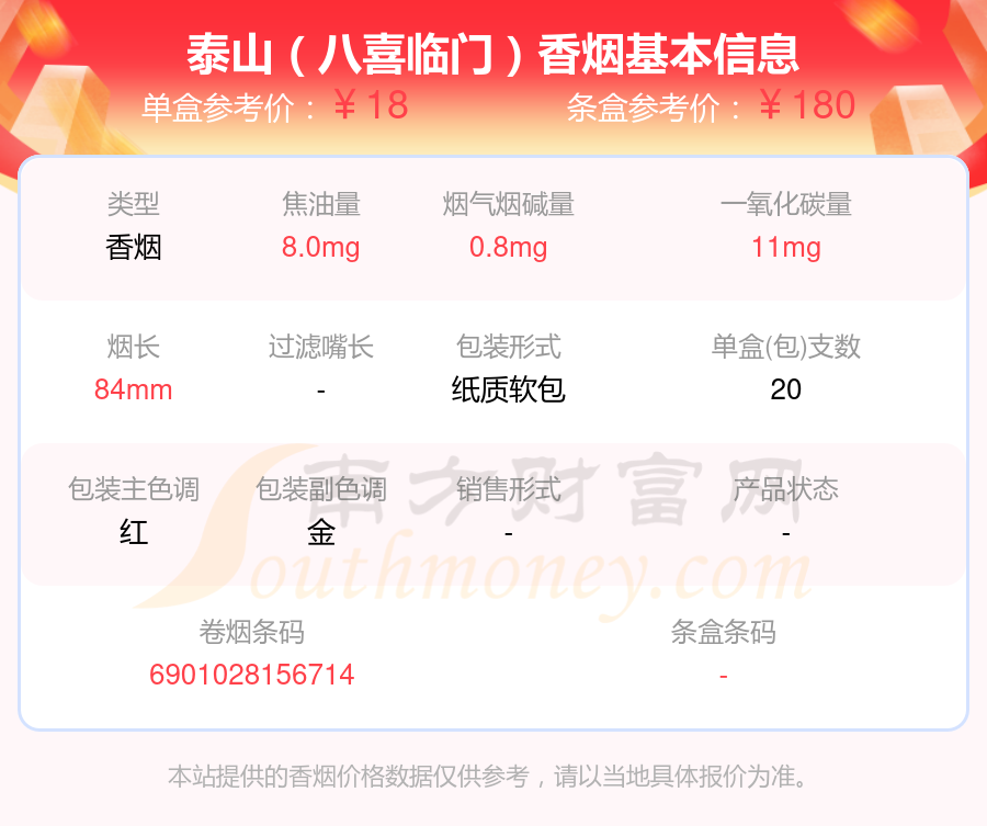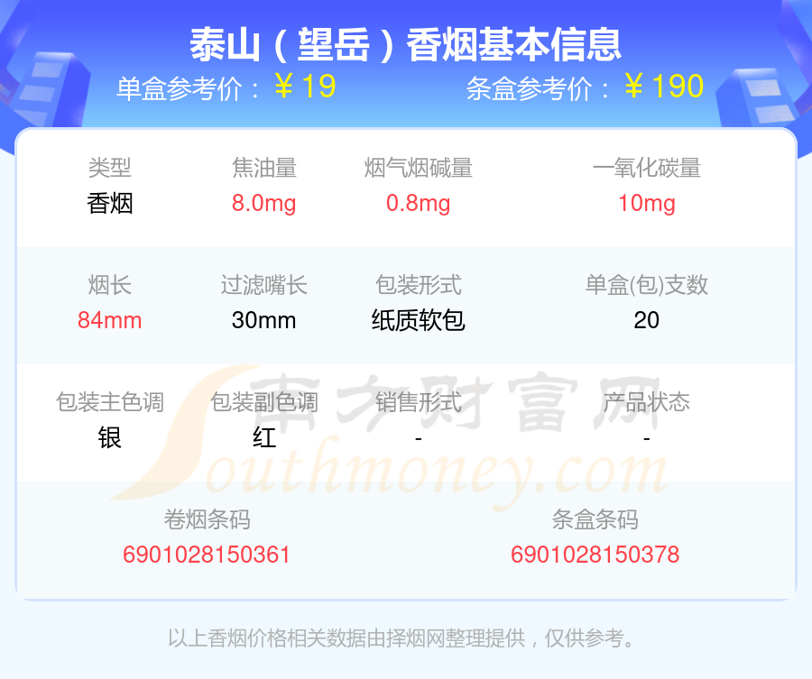 泰山(軟紅八喜)參考價6.0元/包、泰山(中海御葉雙中支)參考價60.0元/包、泰山(八喜)參考價22.0元/包、泰山(八喜臨門)參考價18.0元/包、泰山(望岳)參考價19.0元/包、泰山(錦秀)參考價16.0元/包、泰山(天秀)參考價32.0元/包、泰山(紅秀)參考價22.0元/包、泰山(新東方)參考價14.0元/包、泰山(祥秀)參考價11.0元/包等。