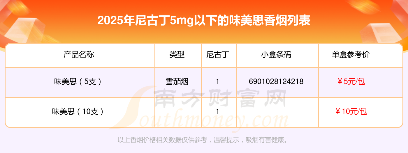 味美思香煙尼古丁5mg以下的煙有味美思(5支)、味美思(10支)等,詳細(xì)價(jià)格如下: