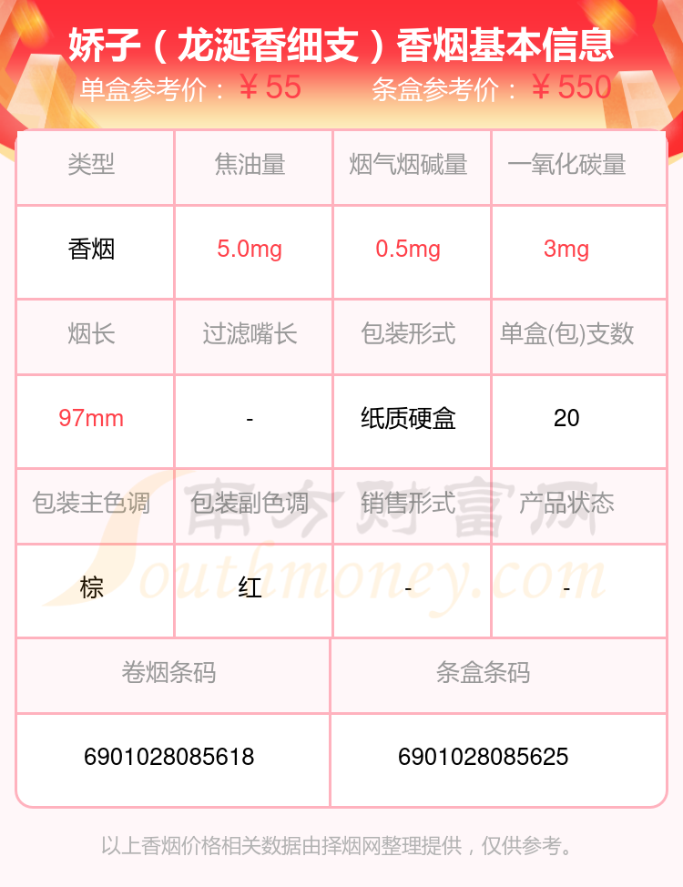 煙堿量低于0.5mg的嬌子香煙有哪些?擇煙網(wǎng)為大家整理盤點(diǎn),有嬌子(龍涎香細(xì)支)、嬌子(X2)等,詳細(xì)價(jià)格如下: