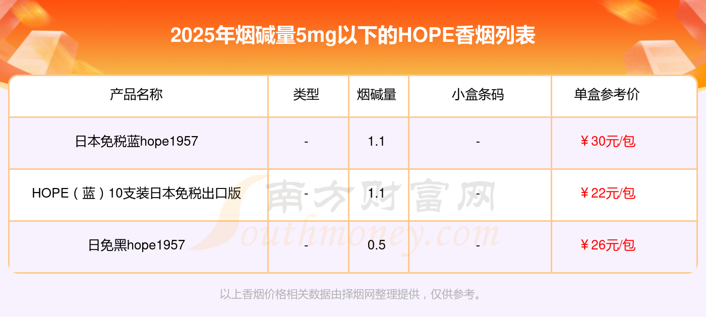 HOPE香煙煙堿量5mg以下的煙有日本免稅藍hope1957、HOPE(藍)10支裝日本免稅出口版、日免黑hope1957等,詳細價格如下: