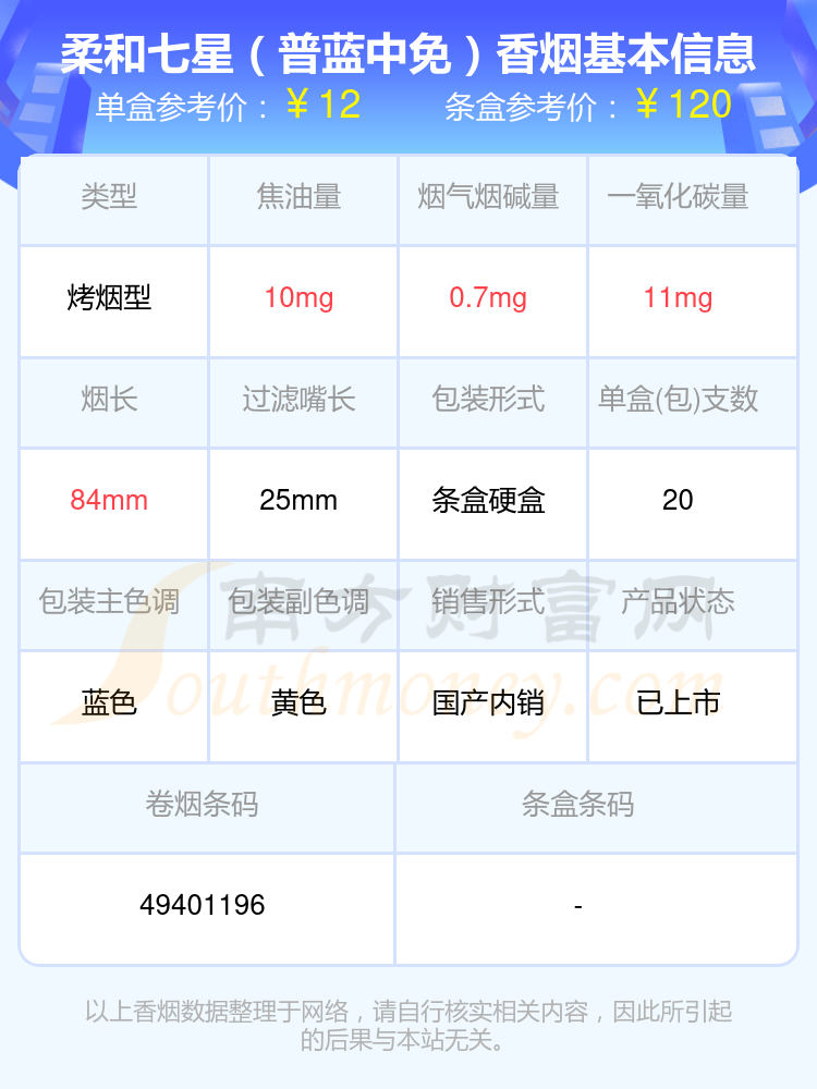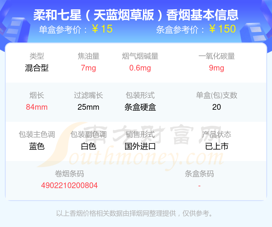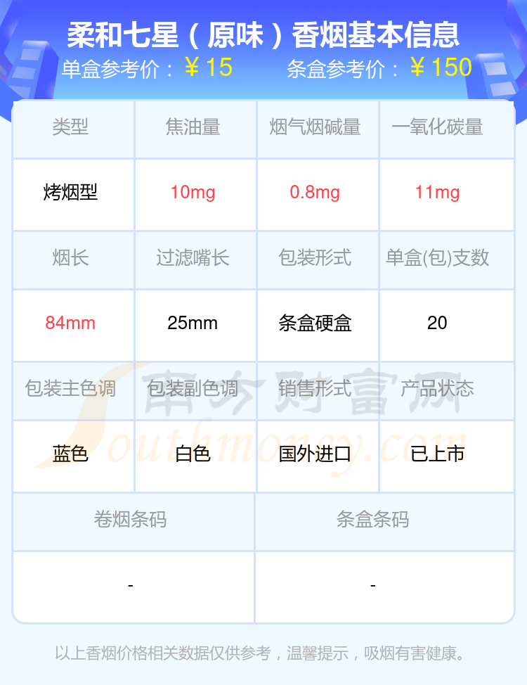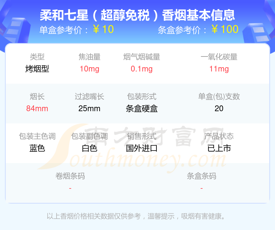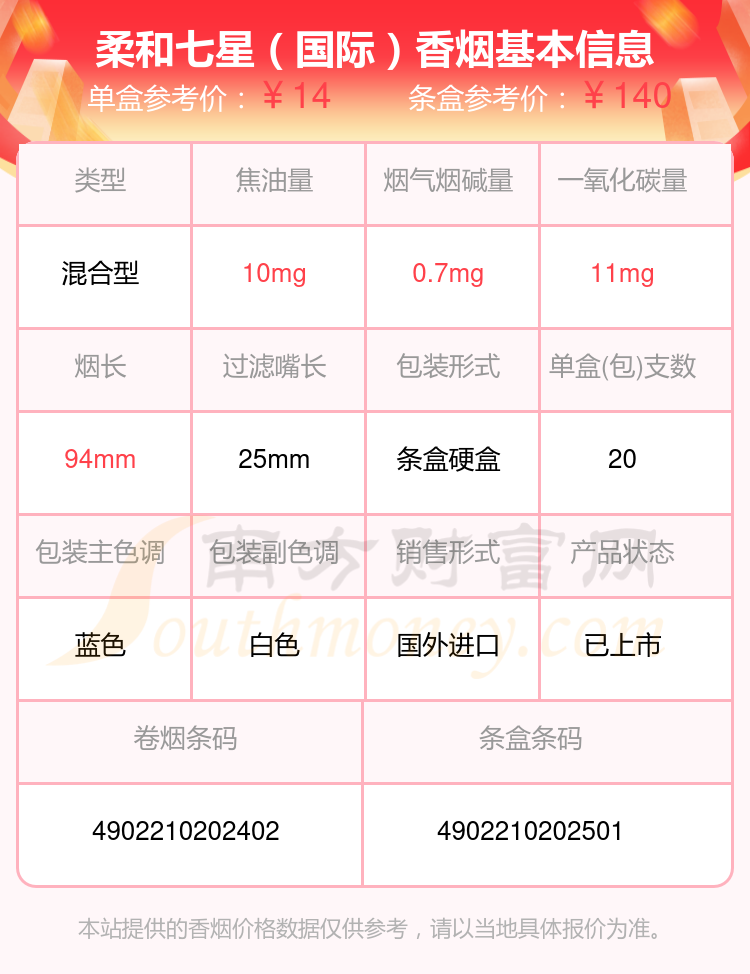 MILDSEVEN柔和七星香煙煙堿1mg以下的煙有柔和七星(原味)、柔和七星(國際)、柔和七星(普藍(lán)中免)、柔和七星(天藍(lán)煙草版)、七星(晶選)、柔和七星(超醇6mg日版)、柔和七星(超醇免稅)等,具體價(jià)格如下: