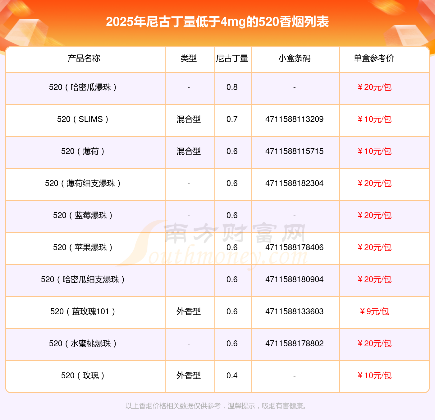擇煙網(wǎng)為大家盤點了520香煙尼古丁量低于4mg的,分別有520(哈密瓜爆珠)、520(SLIMS)、520(薄荷)、520(薄荷細(xì)支爆珠)、520(藍(lán)莓爆珠)、520(蘋果爆珠)、520(哈密瓜細(xì)支爆珠)、520(藍(lán)玫瑰101)、520(水蜜桃爆珠)、520(玫瑰)等,具體價格如下:
