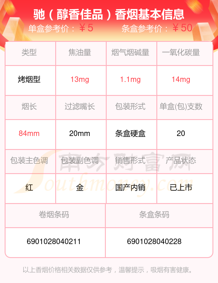 馳香煙煙堿量低于10mg的煙分別有馳(精品軟)參考價10元/包、馳(醇香佳品)參考價5元/包等。