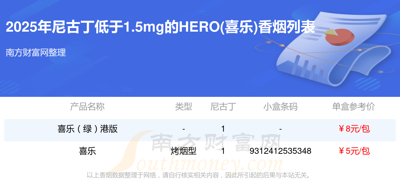 擇煙網(wǎng)為大家盤點了尼古丁低于1.5mg的HERO(喜樂)香煙,分別有喜樂(綠)港版、喜樂等,具體價格如下:
