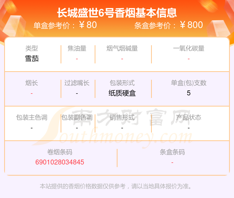 長(zhǎng)城盛世6號(hào)單盒參考價(jià):80元
