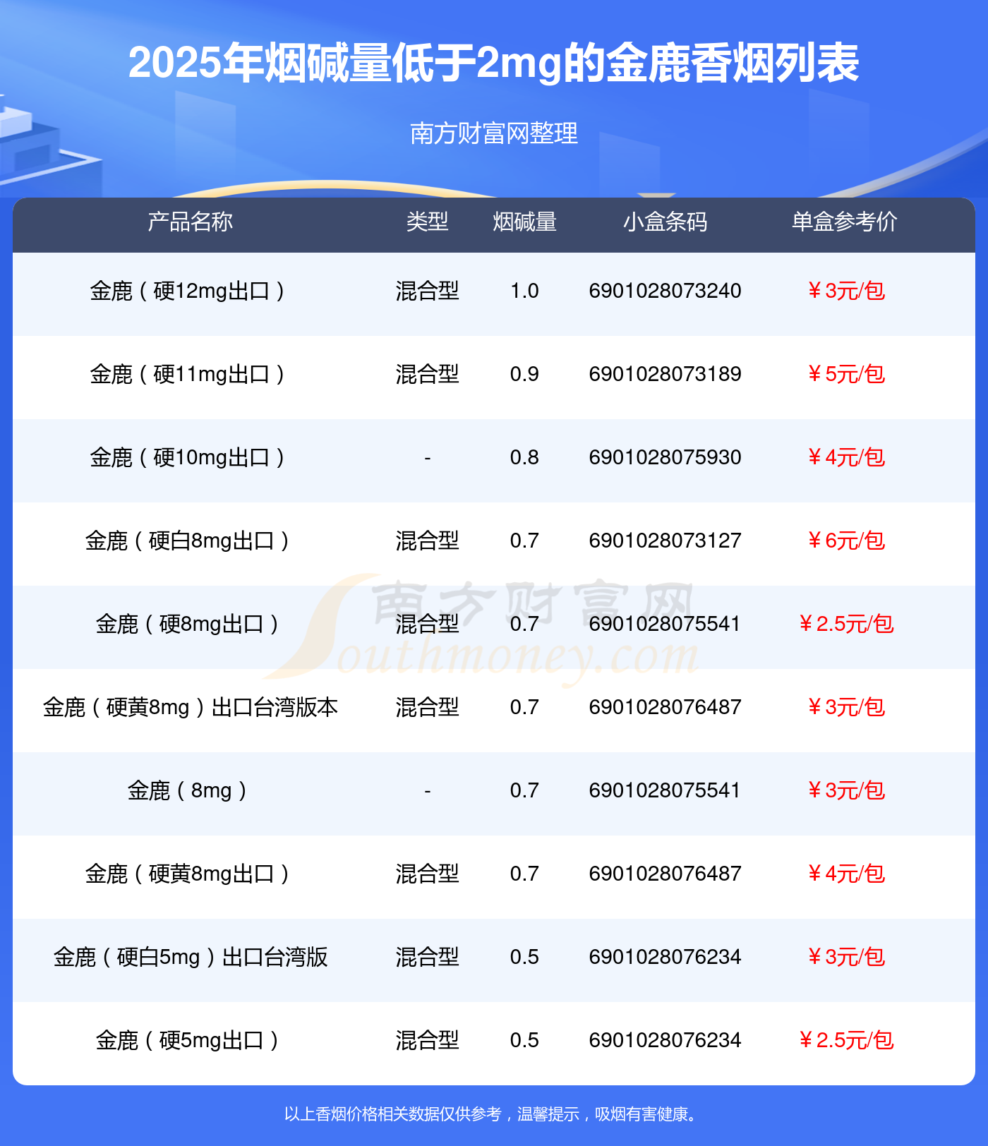 金鹿(硬12mg出口)參考價(jià)3.0元/包、金鹿(硬11mg出口)參考價(jià)5.0元/包、金鹿(硬10mg出口)參考價(jià)4元/包、金鹿(硬白8mg出口)參考價(jià)6.0元/包、金鹿(硬8mg出口)參考價(jià)2.5元/包、金鹿(硬黃8mg)出口臺灣版本參考價(jià)3.0元/包、金鹿(8mg)參考價(jià)3元/包、金鹿(硬黃8mg出口)參考價(jià)4.0元/包、金鹿(硬白5mg)出口臺灣版參考價(jià)3.0元/包、金鹿(硬5mg出口)參考價(jià)2.5元/包等。