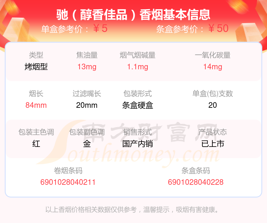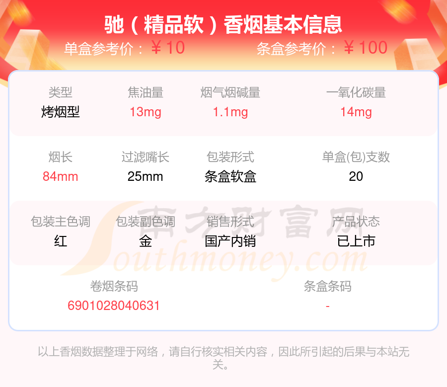 馳香煙煙堿量低于3mg的煙有馳(精品軟)、馳(醇香佳品)等,詳細(xì)價(jià)格如下: