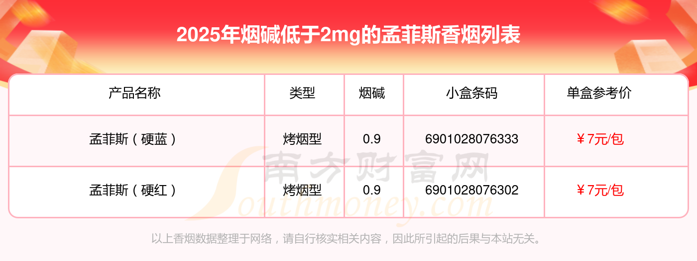 擇煙網(wǎng)為大家盤點(diǎn)了孟菲斯香煙煙堿低于2mg的,分別有孟菲斯(硬藍(lán))、孟菲斯(硬紅)等,具體價(jià)格如下: