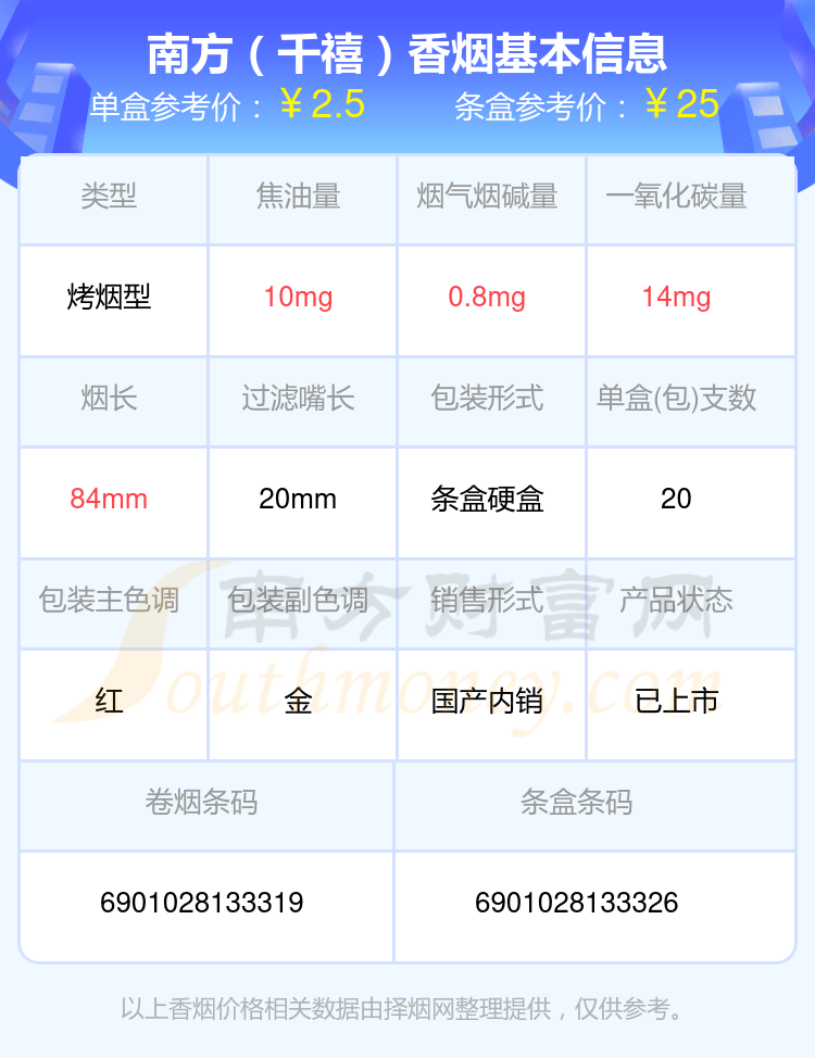 焦油量8mg至15mg左右的南方香煙有哪些?擇煙網(wǎng)為大家整理盤點,有南方(特醇)、南方(千禧)等,詳細價格如下: