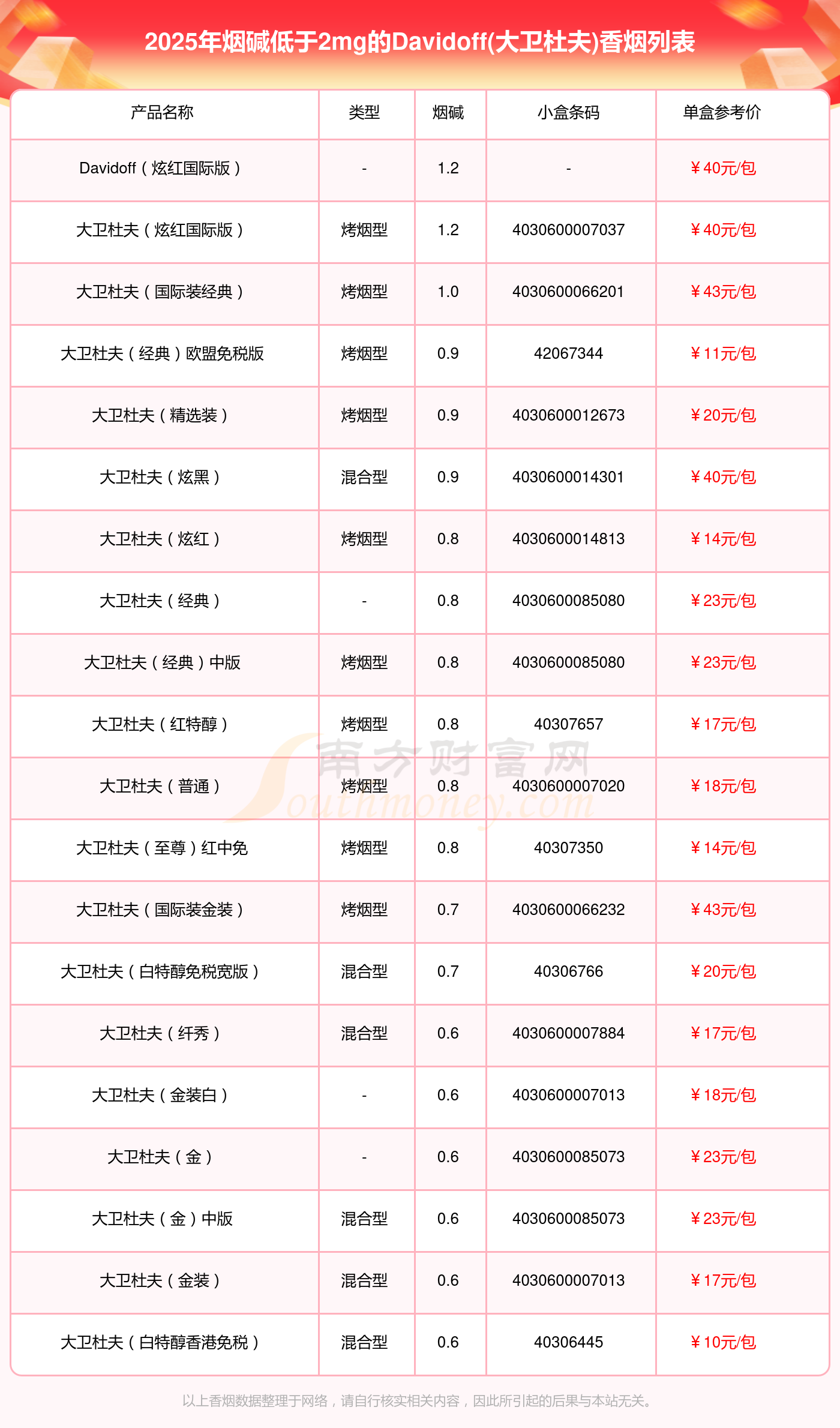 Davidoff(大衛(wèi)杜夫)香煙煙堿低于2mg的有哪些?擇煙網(wǎng)為大家整理提供,分別有: