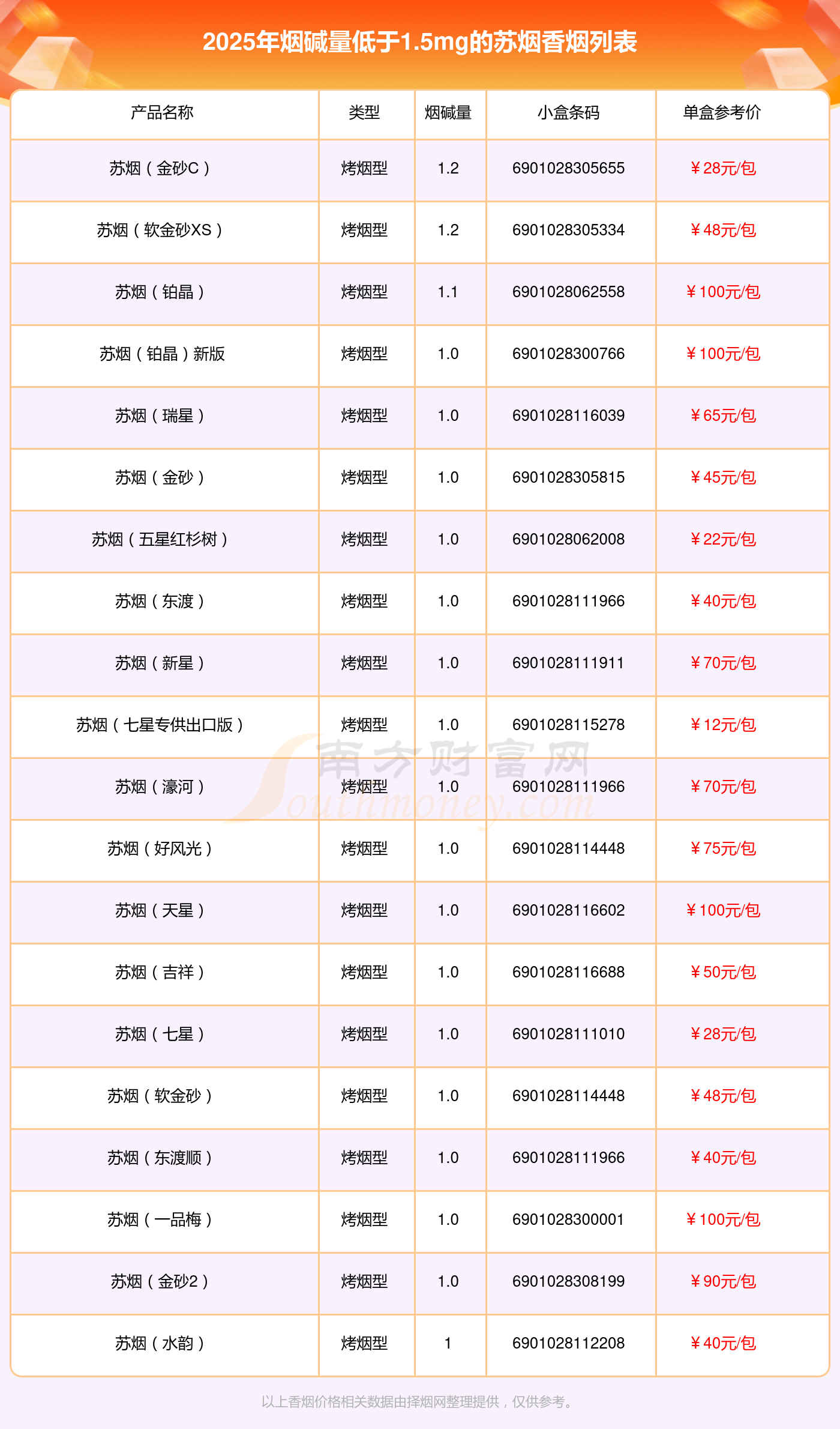 煙堿量低于1.5mg的蘇煙香煙有哪些?擇煙網(wǎng)為大家整理盤(pán)點(diǎn),有蘇煙(金砂C)、蘇煙(軟金砂XS)、蘇煙(鉑晶)、蘇煙(鉑晶)新版、蘇煙(瑞星)、蘇煙(金砂)、蘇煙(五星紅杉樹(shù))、蘇煙(東渡)、蘇煙(新星)、蘇煙(七星專(zhuān)供出口版)等,詳細(xì)價(jià)格如下: