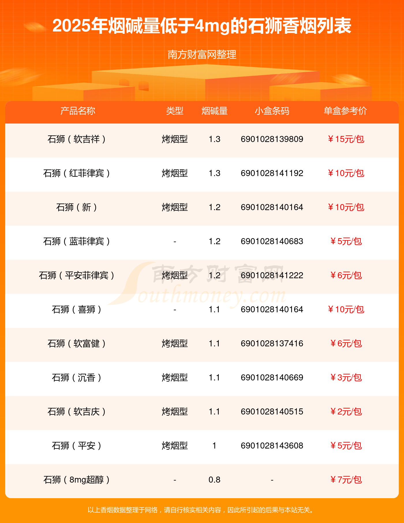 擇煙網(wǎng)為大家盤點了石獅香煙煙堿量低于4mg的,分別有石獅(軟吉祥)、石獅(紅菲律賓)、石獅(新)、石獅(藍菲律賓)、石獅(平安菲律賓)、石獅(喜獅)、石獅(軟富。、石獅(沉香)、石獅(軟吉慶)、石獅(平安)等,詳細價格如下: