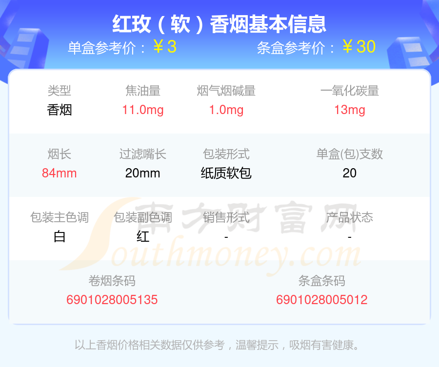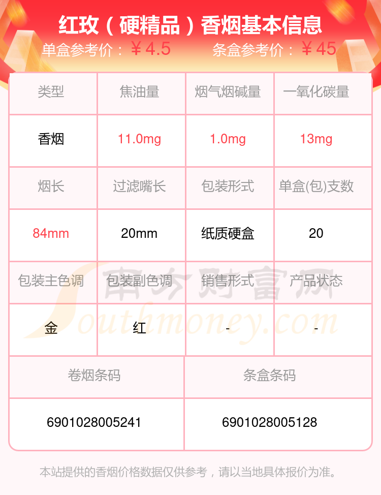 紅玫香煙焦油量8-15mg的煙有紅玫(軟)、紅玫(硬精品)等,具體價(jià)格如下: