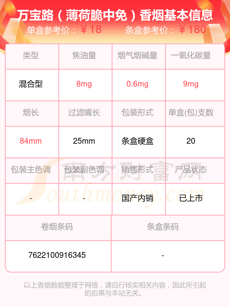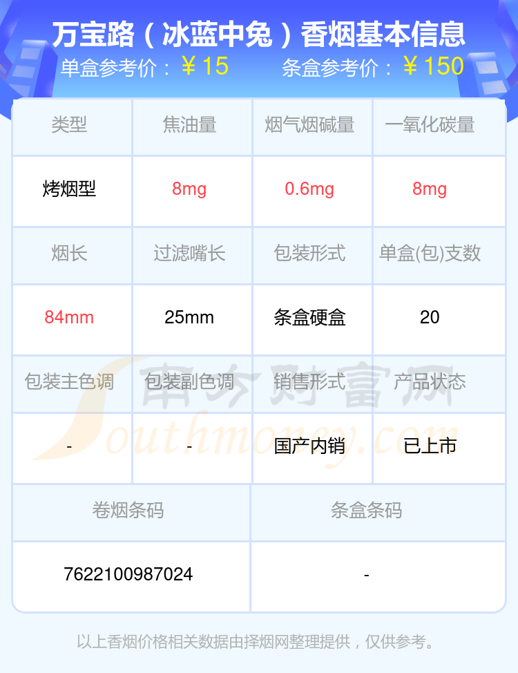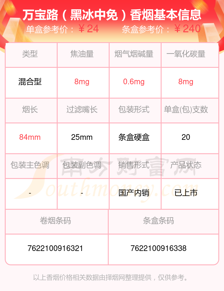 萬寶路(硬紅中兔)參考價9元/包、萬寶路(軟紅2.0)參考價16元/包、萬寶路(雙爆珠藍(lán)莓)參考價24元/包、萬寶路(雙爆珠橙味)參考價24元/包、萬寶路(冰藍(lán)中兔)參考價15元/包、萬寶路(硬冰爵2.0)參考價24元/包、萬寶路(黑冰中免)參考價24元/包、萬寶路(薄荷脆中免)參考價18元/包、萬寶路(硬綠)參考價12元/包、萬寶路(黑睿)參考價38元/包等。