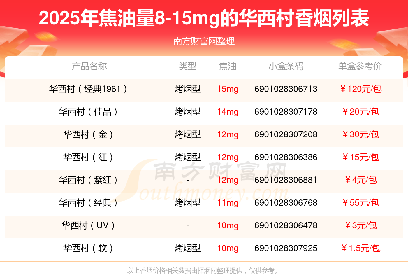 擇煙網(wǎng)為大家盤點了華西村香煙焦油量8-15mg的,分別有華西村(經(jīng)典1961)、華西村(佳品)、華西村(金)、華西村(紅)、華西村(紫紅)、華西村(經(jīng)典)、華西村(UV)、華西村(軟)等,具體價格如下: