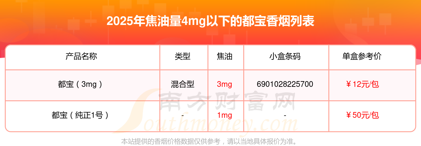 都寶香煙焦油量4mg以下的煙有都寶(3mg)、都寶(純正1號)等,具體價格如下: