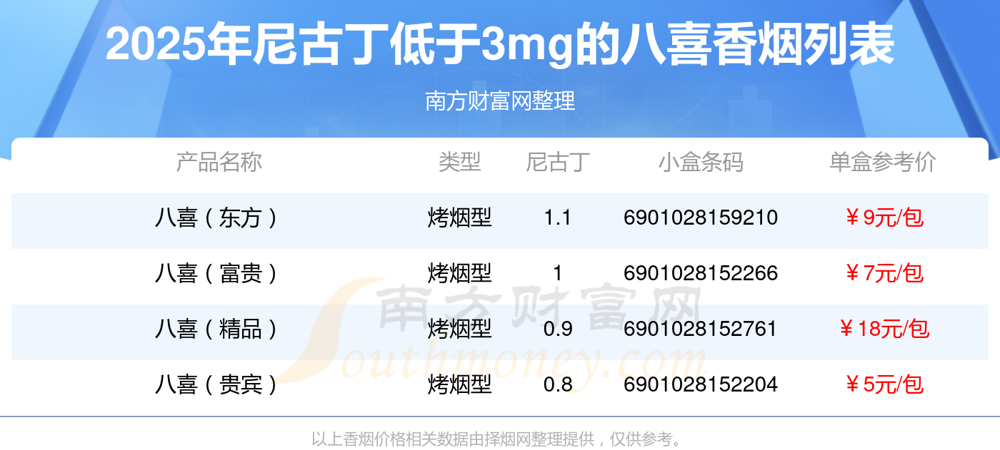 八喜香煙尼古丁低于3mg的有哪些?擇煙網(wǎng)為大家整理提供,分別有: