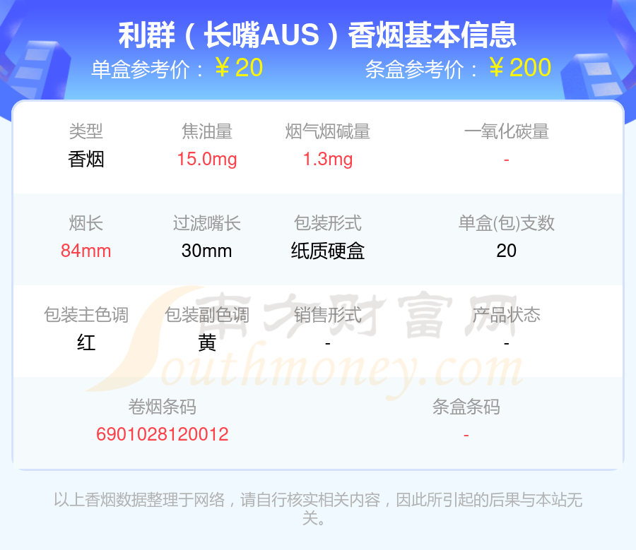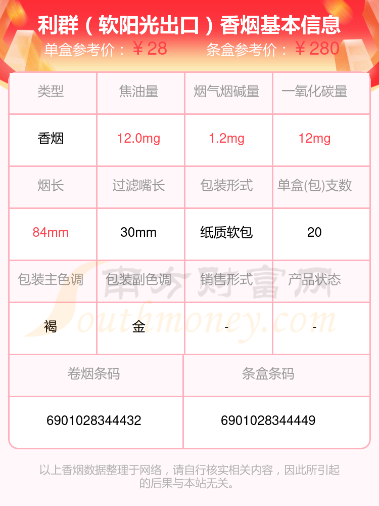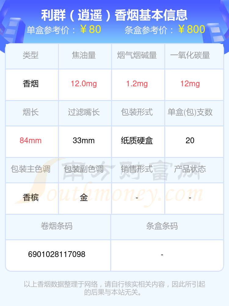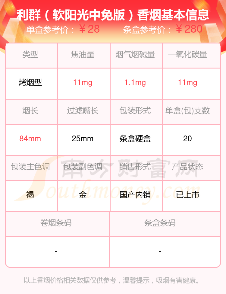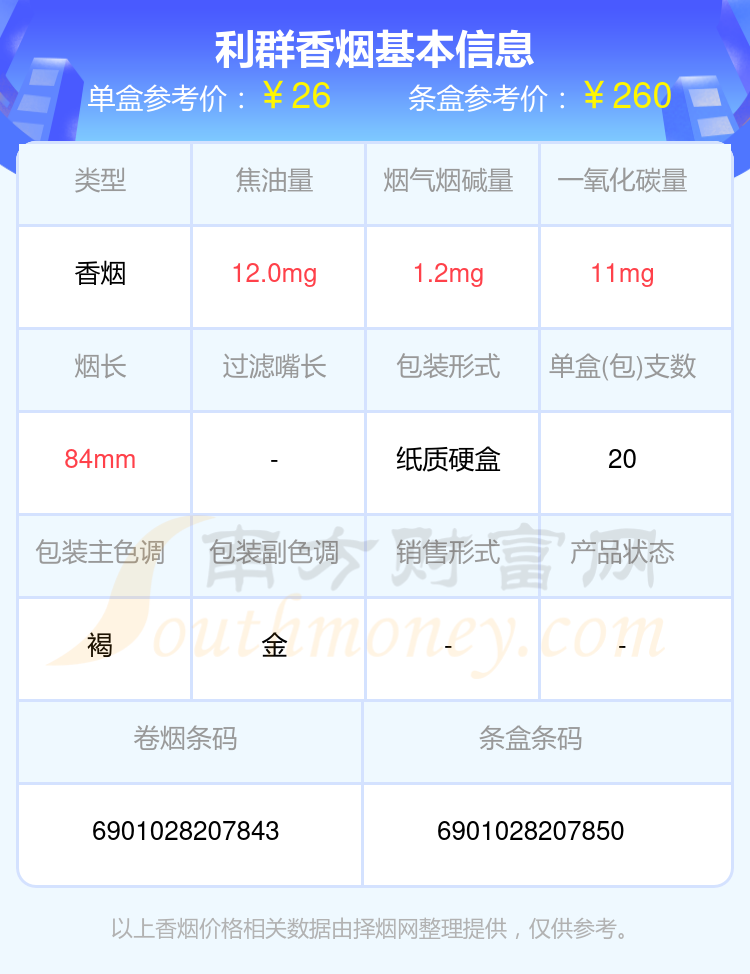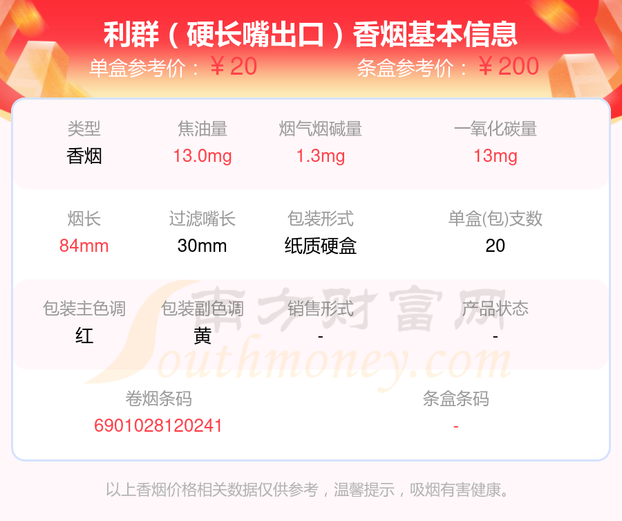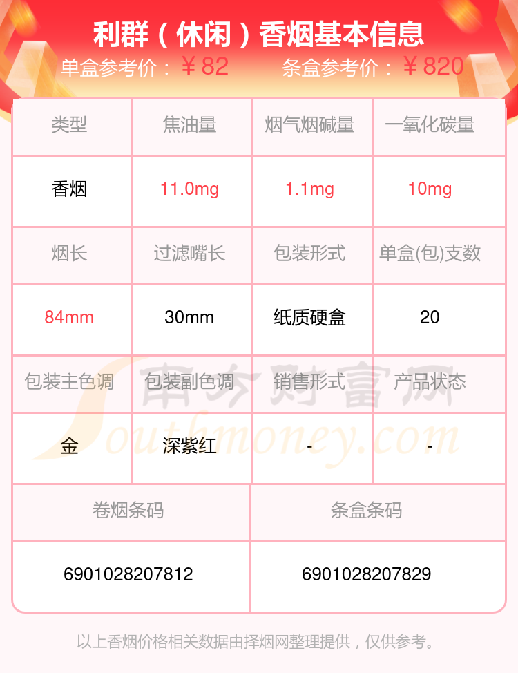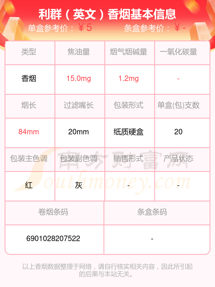 利群(硬長嘴出口)參考價20.0元/包、利群(喜慶英文)參考價180.0元/包、利群(長嘴AUS)參考價20.0元/包、利群(英文)參考價5.0元/包、利群(軟陽光出口)參考價28.0元/包、利群(逍遙)參考價80.0元/包、利群參考價26.0元/包、利群(軟陽光中免版)參考價28元/包、利群(休閑)參考價82.0元/包、利群(軟紅長嘴)參考價22.0元/包等。