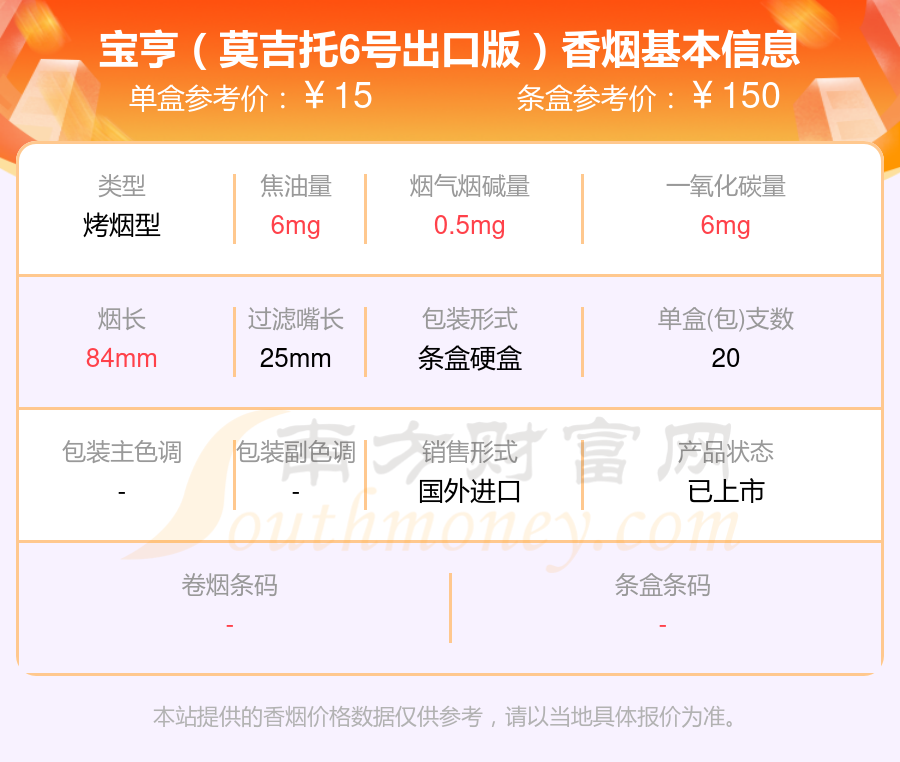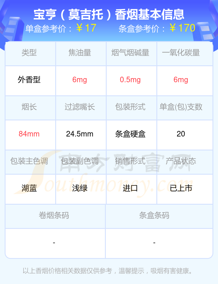 寶亨(寶珠)參考價18元/包、寶亨(莫吉托)參考價17元/包、寶亨(莫吉托6號出口版)參考價15元/包、寶亨(雪茄1號)參考價15元/包等。