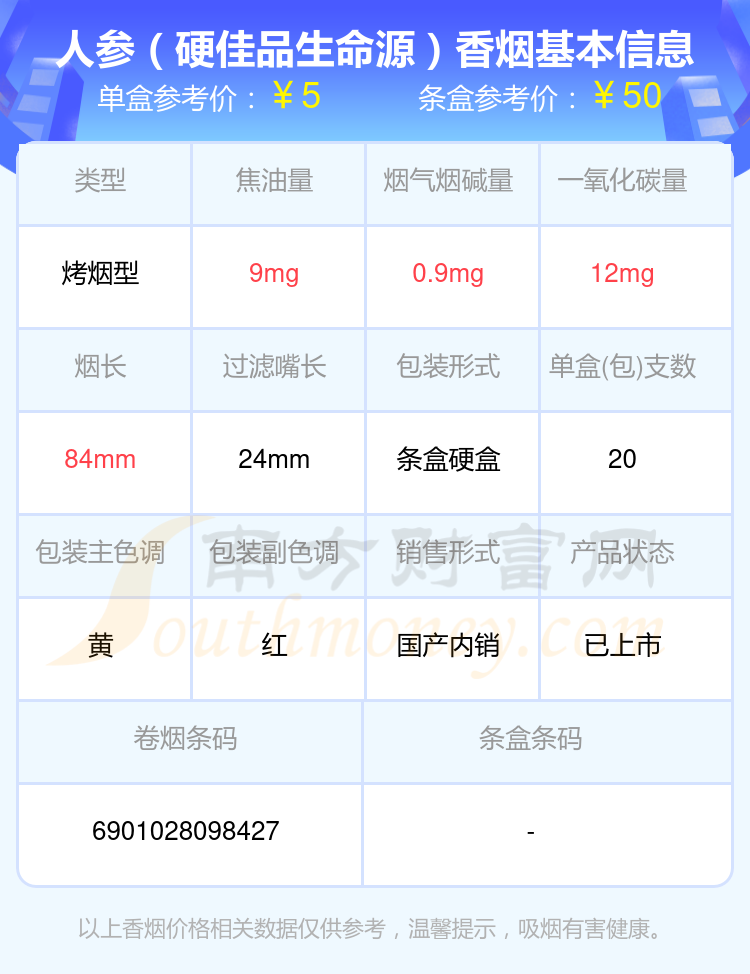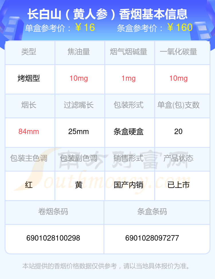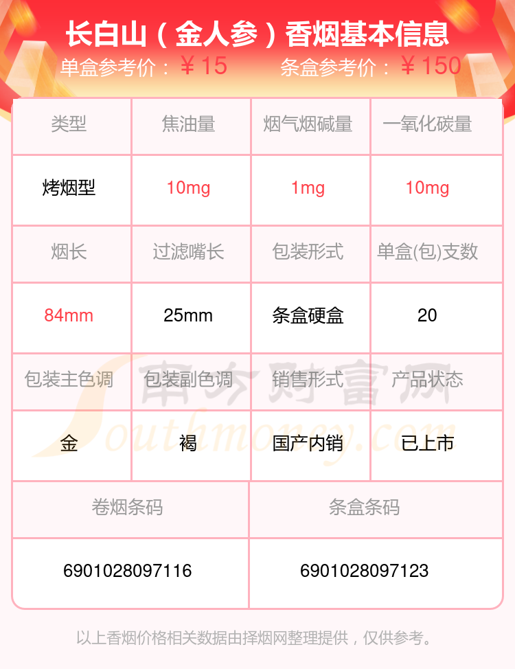 人參香煙尼古丁量1mg以下的煙有長(zhǎng)白山(黃人參)、長(zhǎng)白山(紅人參)、長(zhǎng)白山(金人參)、人參(硬佳品生命源)等,具體價(jià)格如下: