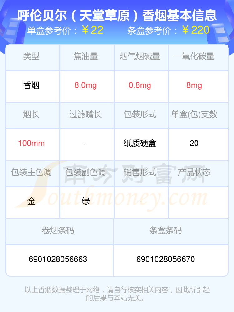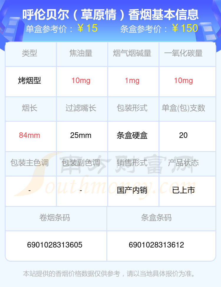 呼倫貝爾(綠)參考價18.0元/包、呼倫貝爾(草原情)參考價15元/包、呼倫貝爾(碧草云天)參考價20元/包、呼倫貝爾(天之韻)參考價26元/包、呼倫貝爾(至臻)參考價40元/包、呼倫貝爾(金)參考價100.0元/包、呼倫貝爾(天堂草原)參考價22.0元/包、呼倫貝爾(草原牧歌)參考價40元/包、呼倫貝爾(金帳汗)參考價85.0元/包、呼倫貝爾(金戈鐵馬)參考價50.0元/包等。