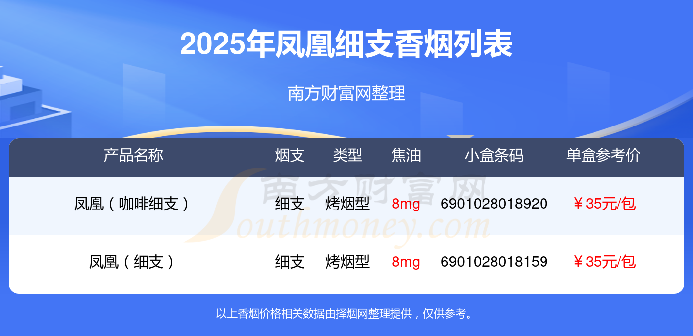 鳳凰香煙細(xì)支的煙分別有鳳凰(咖啡細(xì)支)參考價35.0元/包、鳳凰(細(xì)支)參考價35.0元/包等。