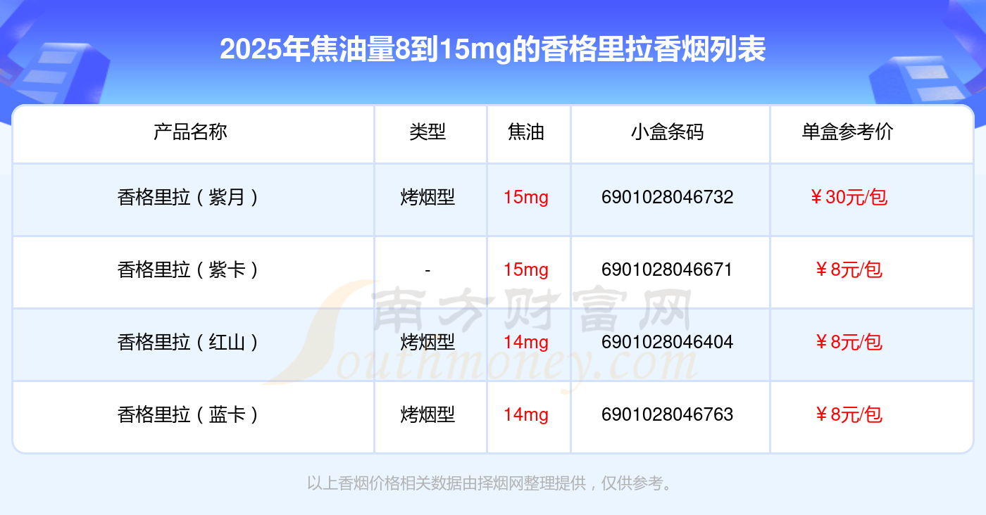 焦油量8到15mg的香格里拉香煙有哪些?擇煙網(wǎng)為大家整理盤點,有香格里拉(紫月)、香格里拉(紫卡)、香格里拉(紅山)、香格里拉(藍卡)等,詳細價格如下:
