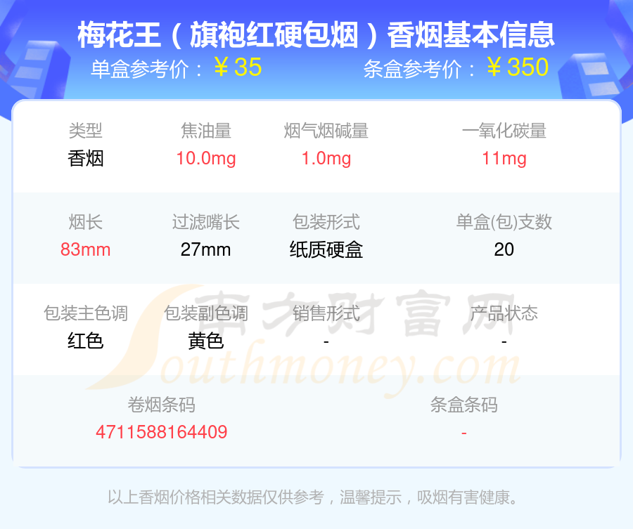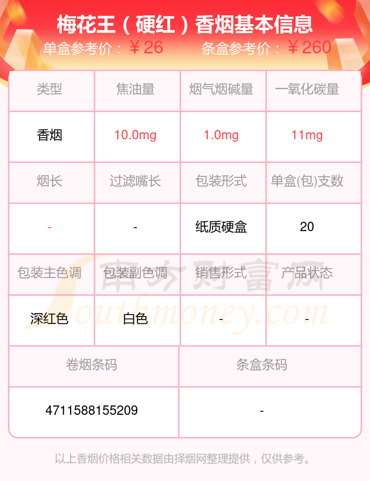 擇煙網(wǎng)為大家盤點(diǎn)了焦油量8mg-15mg左右的梅花王香煙,有梅花王(硬紅)、梅花王(硬藍(lán))、梅花王(旗袍紅硬包煙)等,詳細(xì)價(jià)格如下: