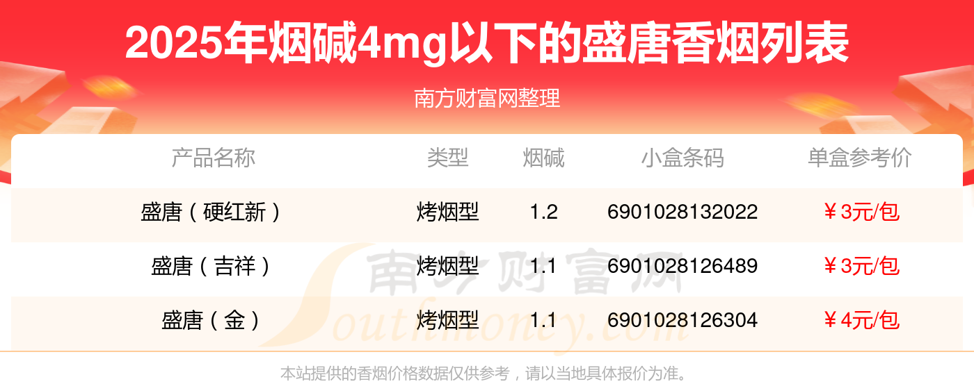 煙堿4mg以下的盛唐香煙有哪些?擇煙網(wǎng)為大家整理盤點,有盛唐(硬紅新)、盛唐(吉祥)、盛唐(金)等,詳細價格如下: