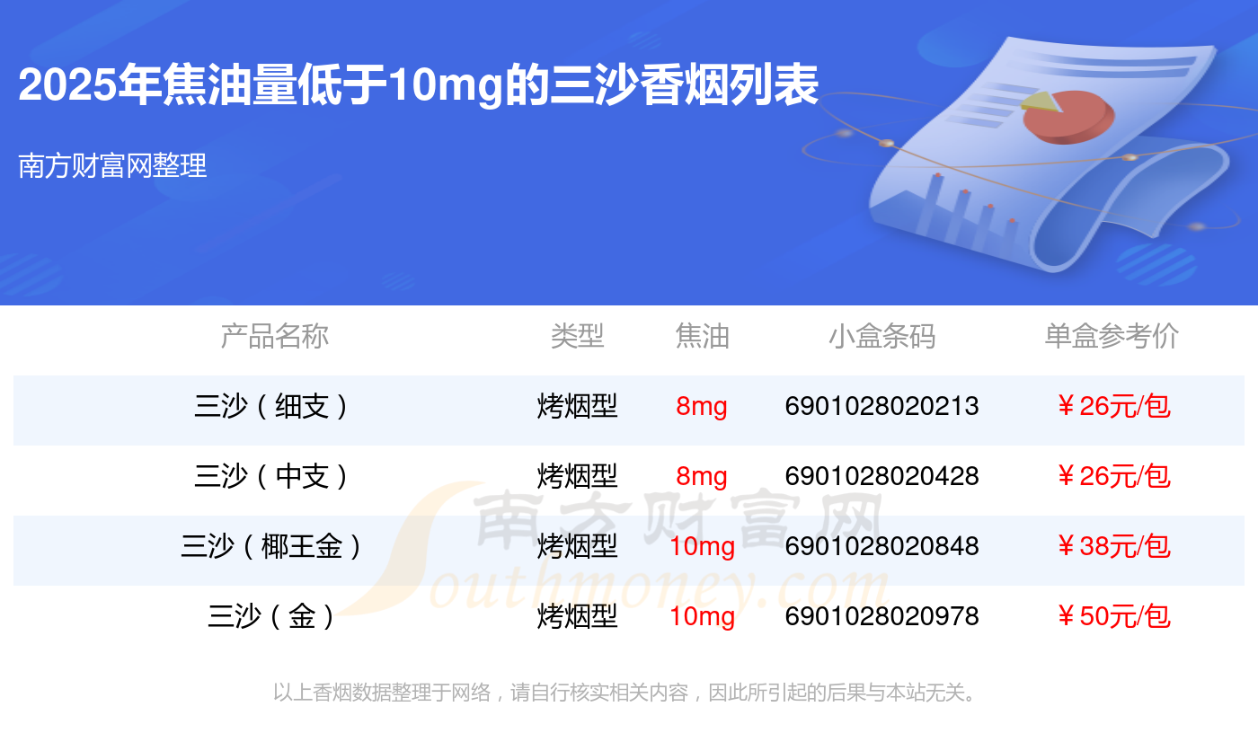 三沙香煙焦油量低于10mg的煙分別有三沙(細(xì)支)參考價(jià)26.0元/包、三沙(中支)參考價(jià)26.0元/包、三沙(椰王金)參考價(jià)38.0元/包、三沙(金)參考價(jià)50.0元/包等。
