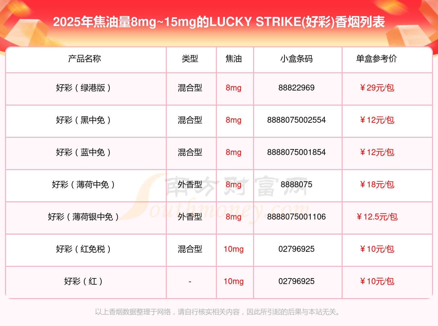 擇煙網(wǎng)為大家盤點了LUCKY STRIKE(好彩)香煙焦油量8mg~15mg的,分別有好彩(綠港版)、好彩(黑中免)、好彩(藍中免)、好彩(薄荷中免)、好彩(薄荷銀中免)、好彩(紅免稅)、好彩(紅)等,詳細價格如下: