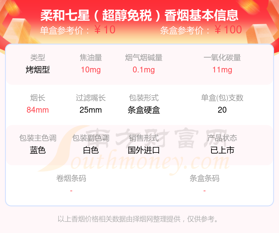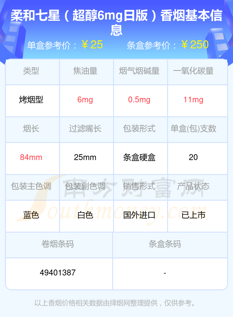 七星(晶選)參考價24元/包、柔和七星(超醇6mg日版)參考價25元/包、柔和七星(超醇免稅)參考價10元/包等。