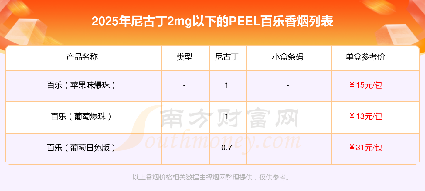 PEEL百樂(lè)香煙尼古丁2mg以下的煙分別有百樂(lè)(蘋(píng)果味爆珠)參考價(jià)15元/包、百樂(lè)(葡萄爆珠)參考價(jià)13元/包、百樂(lè)(葡萄日免版)參考價(jià)31元/包等。