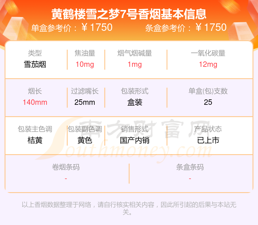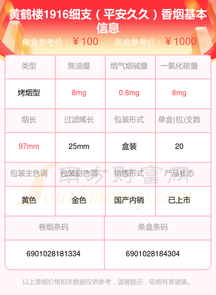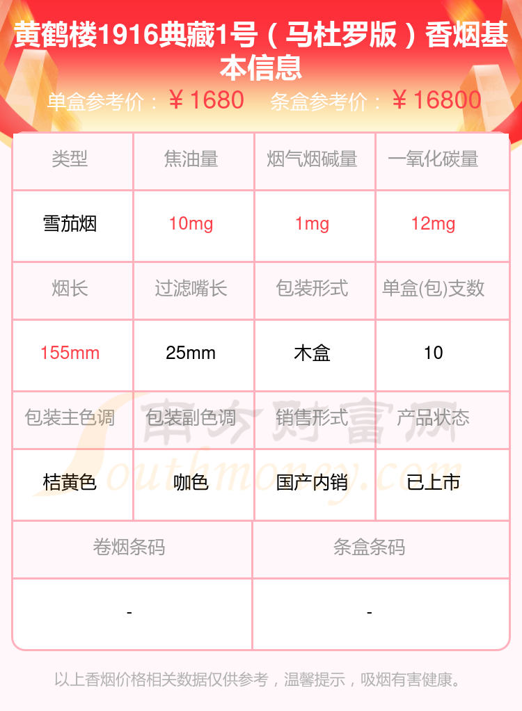 黃鶴樓(雪之夢(mèng)2號(hào))參考價(jià)350元/包、黃鶴樓1916俱樂(lè)部2號(hào)參考價(jià)180元/包、黃鶴樓1916俱樂(lè)部1號(hào)參考價(jià)180元/包、黃鶴樓1916典藏1號(hào)(馬杜羅版)參考價(jià)1680元/包、黃鶴樓1916典藏1號(hào)(普通版)參考價(jià)1280元/包、黃鶴樓雪之夢(mèng)6號(hào)參考價(jià)900元/包、黃鶴樓雪之夢(mèng)7號(hào)參考價(jià)1750元/包、黃鶴樓1916細(xì)支(平安久久)參考價(jià)100元/包等。