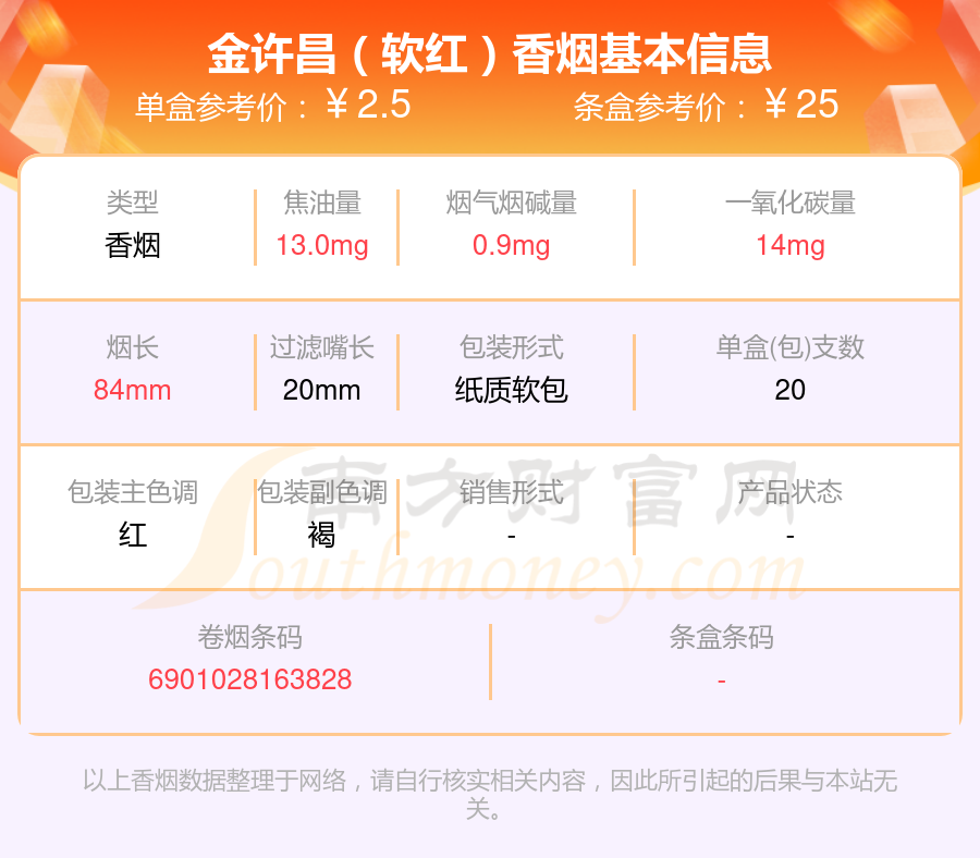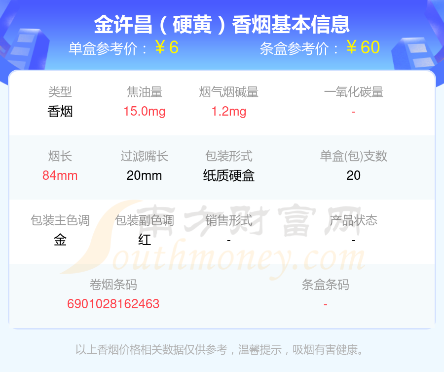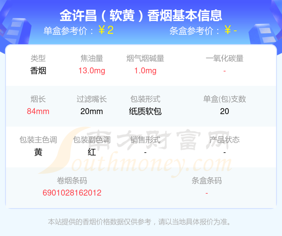 金許昌(硬黃)參考價6.0元/包、金許昌(銀星)參考價5.0元/包、金許昌(硬紅)參考價3.5元/包、金許昌(軟黃)參考價2.0元/包、金許昌(軟紅)參考價2.5元/包等。