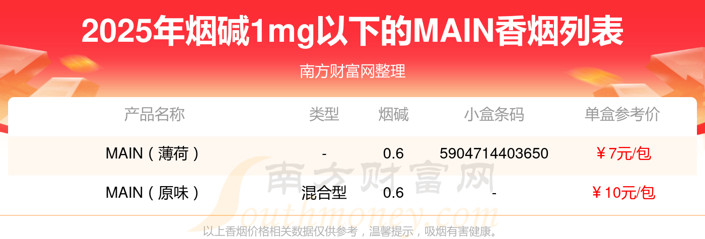MAIN香煙煙堿1mg以下的有哪些?擇煙網(wǎng)為大家整理提供,分別有: