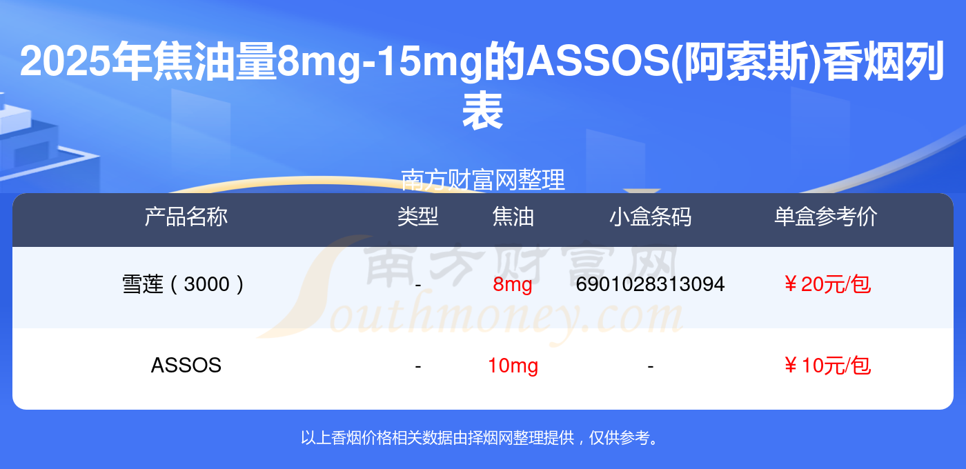 焦油量8mg-15mg的ASSOS(阿索斯)香煙2025一覽