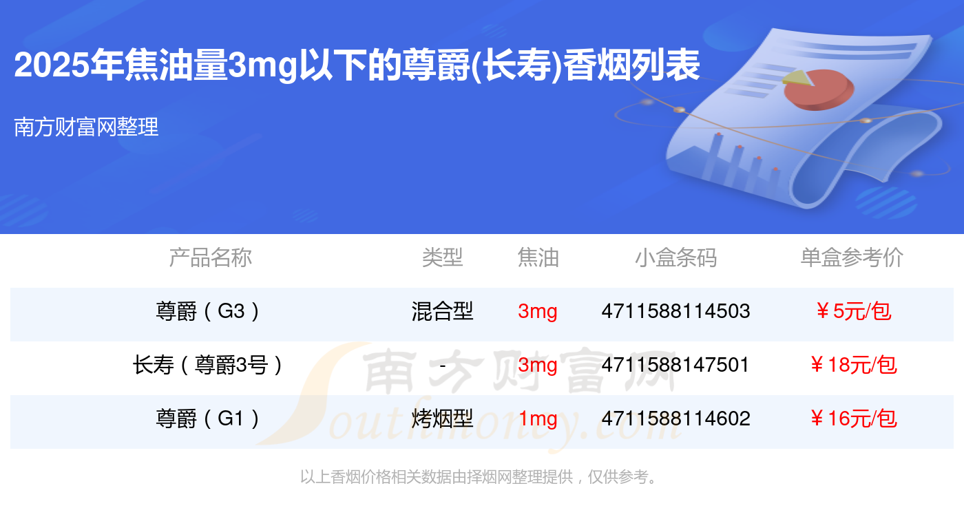 尊爵(長壽)香煙焦油量3mg以下的有哪些?擇煙網(wǎng)為大家整理提供,分別有:
