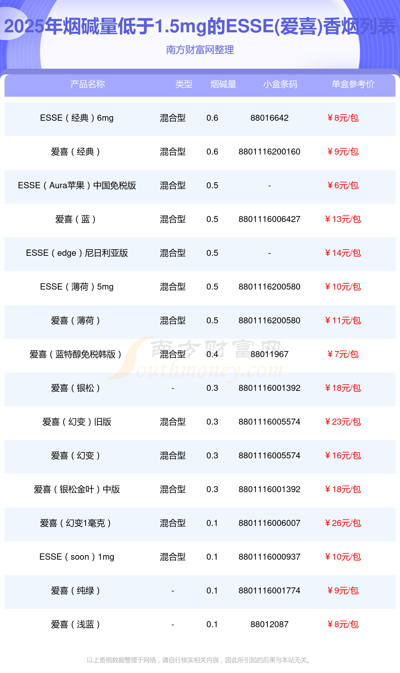 ESSE(經(jīng)典)6mg參考價8.0元/包、愛喜(經(jīng)典)參考價9元/包、ESSE(Aura蘋果)中國免稅版參考價6.0元/包、愛喜(藍)參考價13元/包、ESSE(edge)尼日利亞版參考價14.0元/包、ESSE(薄荷)5mg參考價10.0元/包、愛喜(薄荷)參考價11元/包、愛喜(藍特醇免稅韓版)參考價7.0元/包、愛喜(銀松)參考價18元/包、愛喜(幻變)舊版參考價23.0元/包等。
