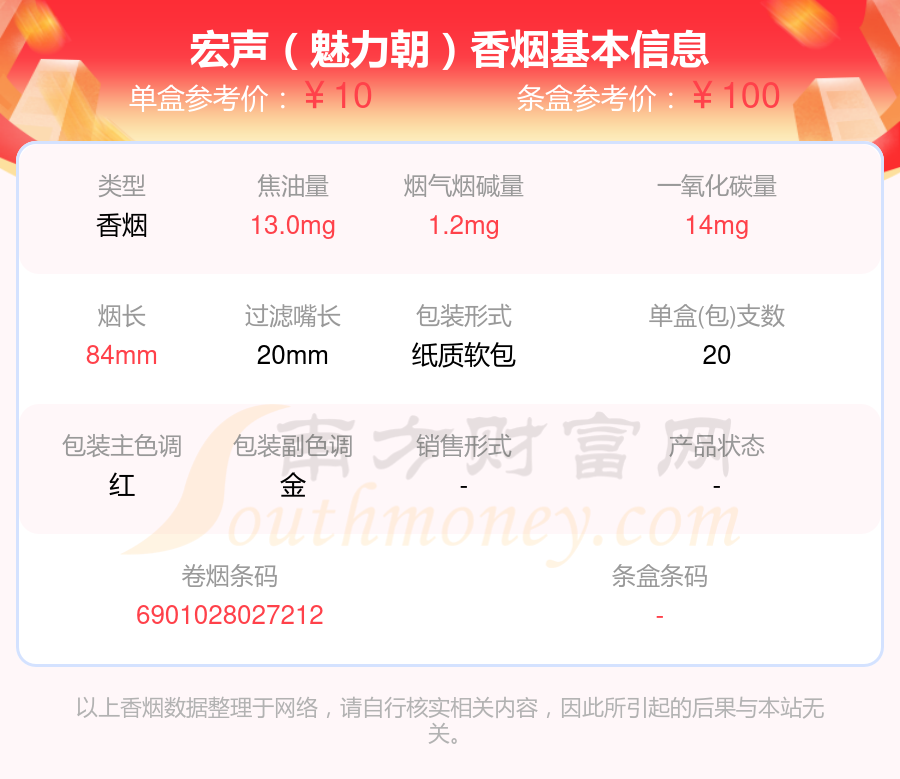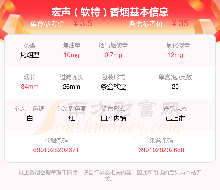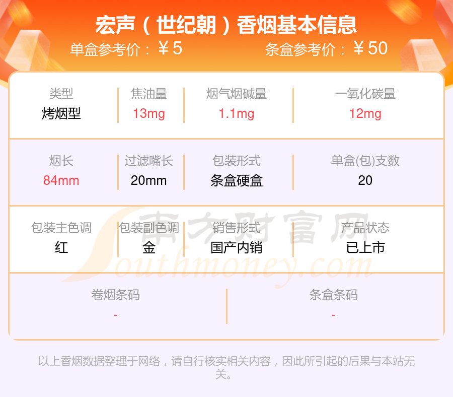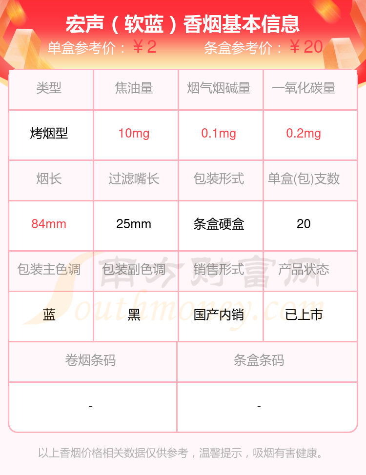 宏聲香煙尼古丁10mg以下的煙有宏聲(時(shí)尚)、宏聲(魅力朝)、宏聲(硬)、宏聲(精品)、宏聲(軟)、宏聲(世紀(jì)朝)、宏聲(軟特)、宏聲(軟藍(lán))等,具體價(jià)格如下: