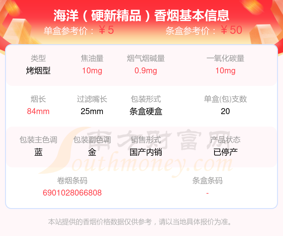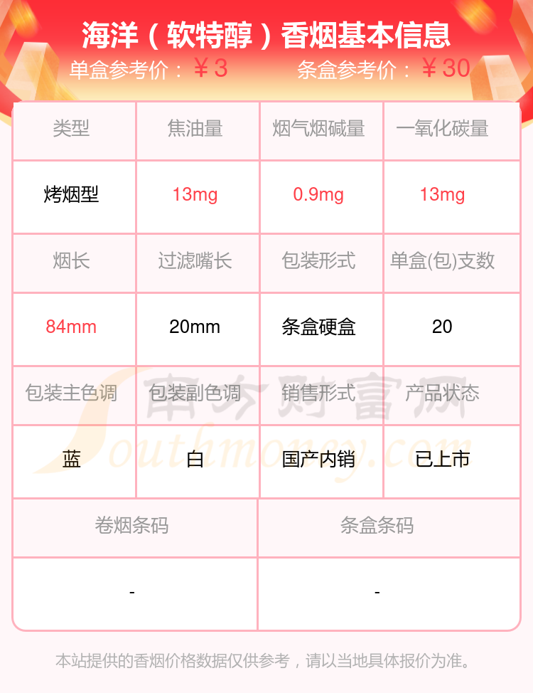 擇煙網(wǎng)為大家盤點了焦油量8mg到15mg的海洋香煙,分別有海洋(軟特醇)、海洋(硬新精品)等,具體價格如下: