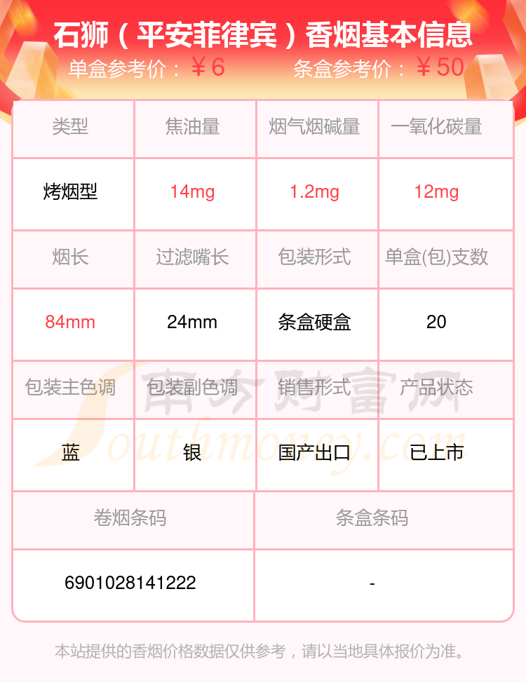 石獅香煙焦油量8-15mg的煙有哪些?擇煙網(wǎng)為大家整理提供,分別有:石獅(8mg超醇)、石獅(新)、石獅(喜獅)、石獅(藍(lán)菲律賓)、石獅(軟吉慶)、石獅(軟吉祥)、石獅(平安菲律賓)、石獅(紅菲律賓)、石獅(軟富。、石獅(沉香)等,具體價格如下:
