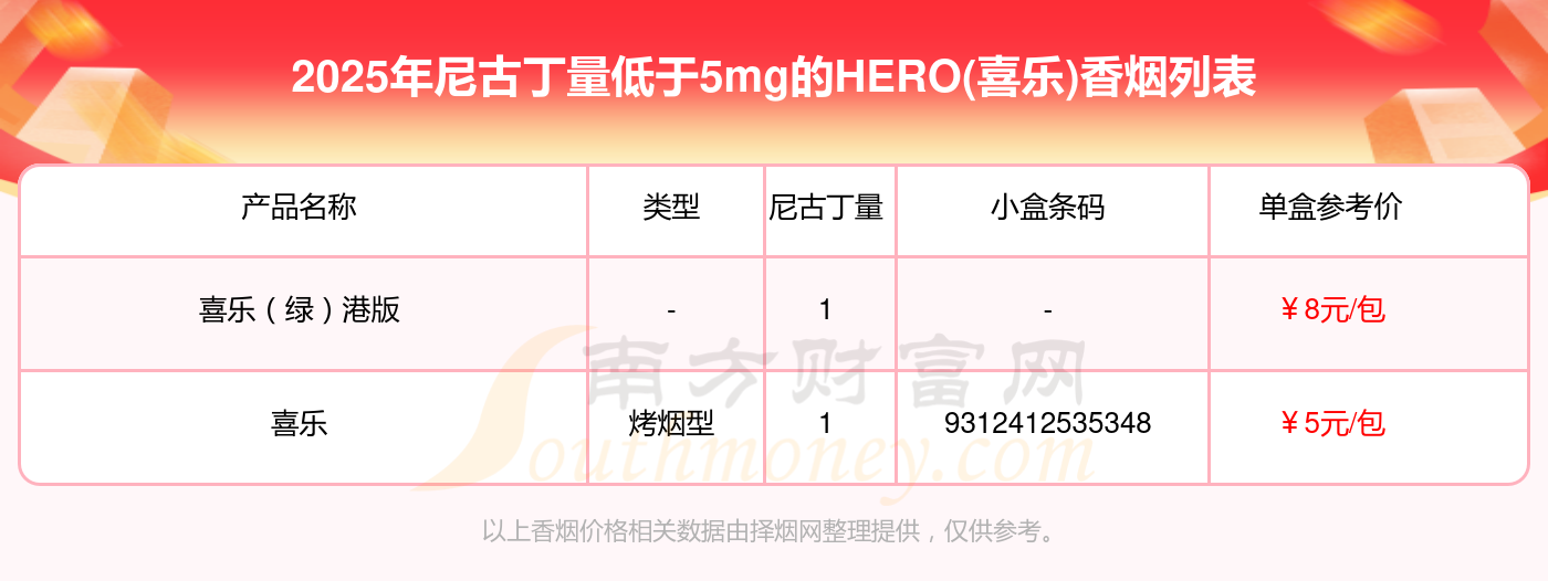 HERO(喜樂)香煙尼古丁量低于5mg的煙有哪些?擇煙網為大家整理提供,分別有:喜樂(綠)港版、喜樂等,具體價格如下: