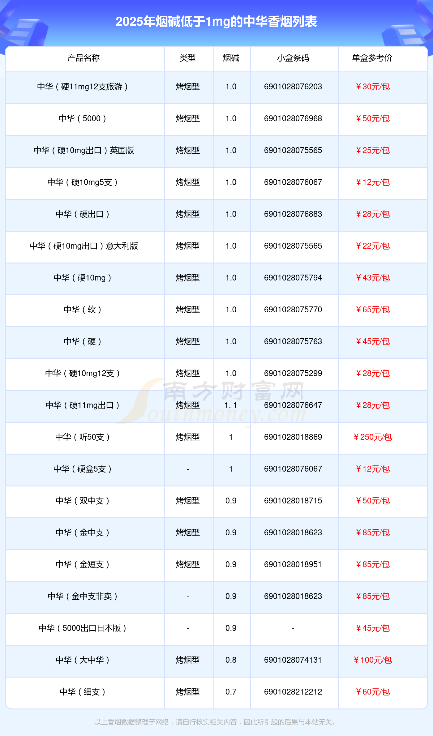 擇煙網(wǎng)為大家盤(pán)點(diǎn)了中華香煙煙堿低于1mg的,分別有中華(硬11mg12支旅游)、中華(5000)、中華(硬10mg出口)英國(guó)版、中華(硬10mg5支)、中華(硬出口)、中華(硬10mg出口)意大利版、中華(硬10mg)、中華(軟)、中華(硬)、中華(硬10mg12支)等,詳細(xì)價(jià)格如下: