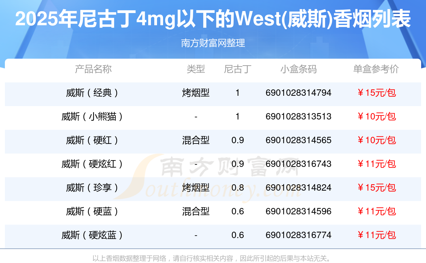 West(威斯)香煙尼古丁4mg以下的煙有威斯(經(jīng)典)、威斯(小熊貓)、威斯(硬紅)、威斯(硬炫紅)、威斯(珍享)、威斯(硬藍(lán))、威斯(硬炫藍(lán))等,詳細(xì)價(jià)格如下:
