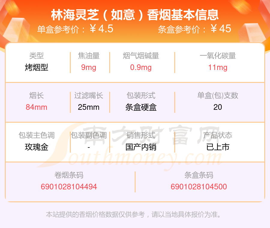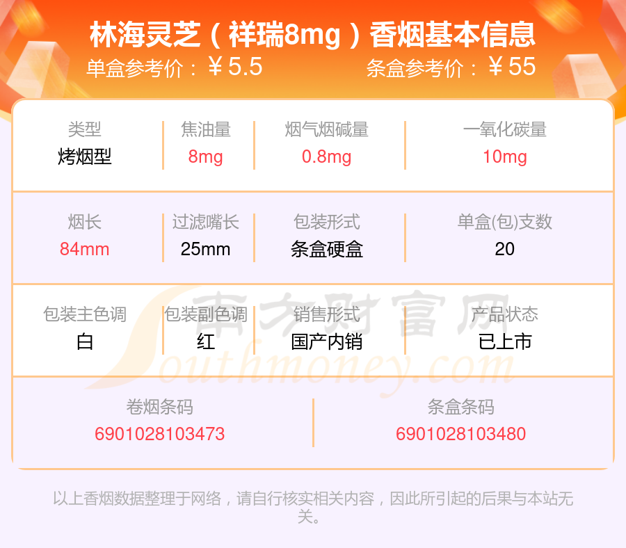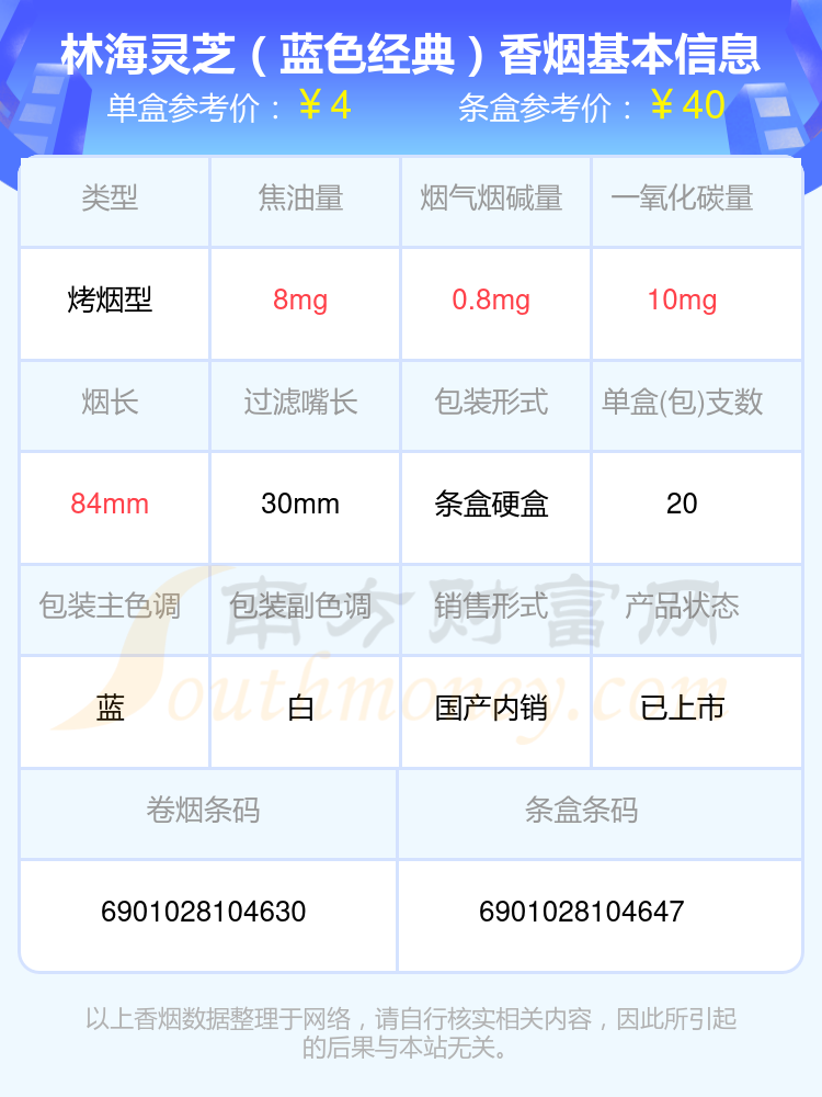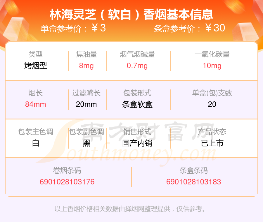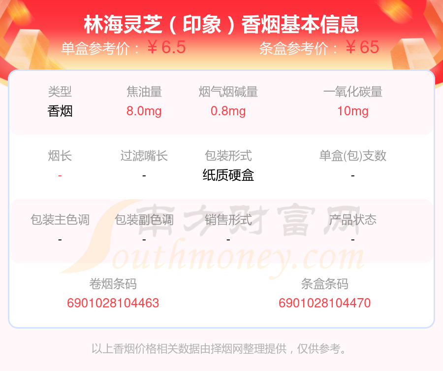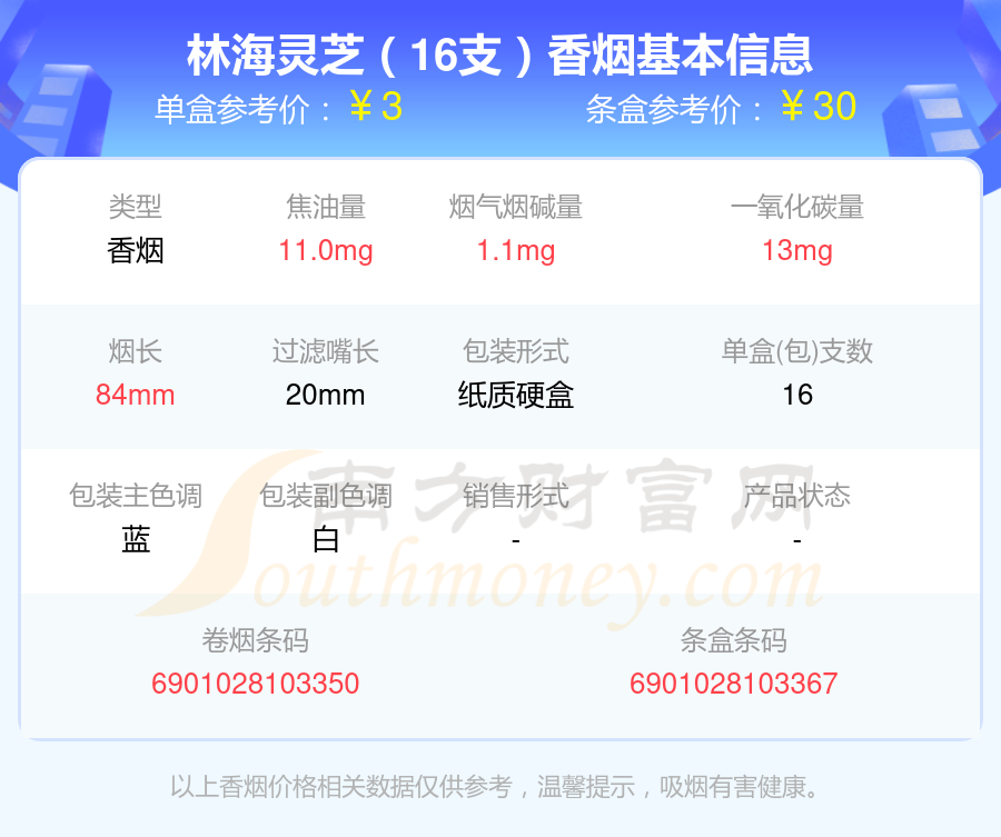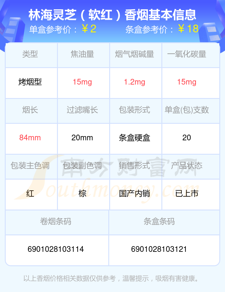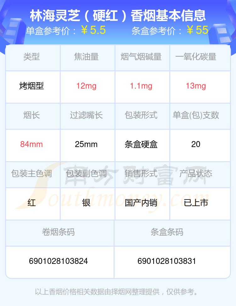 林海靈芝(軟紅)參考價2元/包、林海靈芝(16支)參考價3.0元/包、林海靈芝(硬紅)參考價5.5元/包、林海靈芝(如意)參考價4.5元/包、林海靈芝(硬白)參考價3.0元/包、林海靈芝(藍色經(jīng)典)參考價4元/包、林海靈芝(祥瑞8mg)參考價5.5元/包、林海靈芝(軟如意)參考價4.5元/包、林海靈芝(印象)參考價6.5元/包、林海靈芝(軟白)參考價3元/包等。