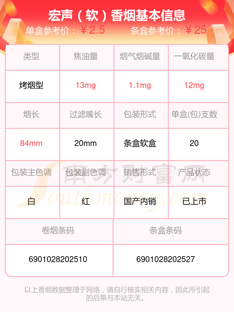 宏聲(時尚)參考價5元/包、宏聲(魅力朝)參考價10.0元/包、宏聲(硬)參考價3元/包、宏聲(軟)參考價2.5元/包、宏聲(世紀朝)參考價5元/包、宏聲(精品)參考價5.5元/包、宏聲(軟特)參考價3.5元/包、宏聲(軟藍)參考價2元/包等。