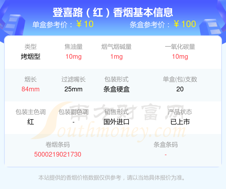 擇煙網(wǎng)為大家盤點(diǎn)了尼古丁1-2mg左右的DUNHILL(登喜路)香煙,有登喜路(紅免稅)、登喜路(紅)等,詳細(xì)價(jià)格如下: